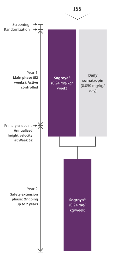 REAL8 was a global, multicenter, randomized, open-label, active-comparator, phase 3 basket study. A total of 88 GH-treatment-naïve children 2.8-10.8 years with ISS were randomized to Sogroya® 0.24 mg/kg/week (n=60) or daily somatropin 0.05 mg/kg/day (n=28). Dose 0.05 mg/kg/day of daily somatropin is less than the maximum dose (0.067 mg/kg/day) approved for use in pediatric patients with ISS in the US. The primary endpoint was AHV at Week 52.1